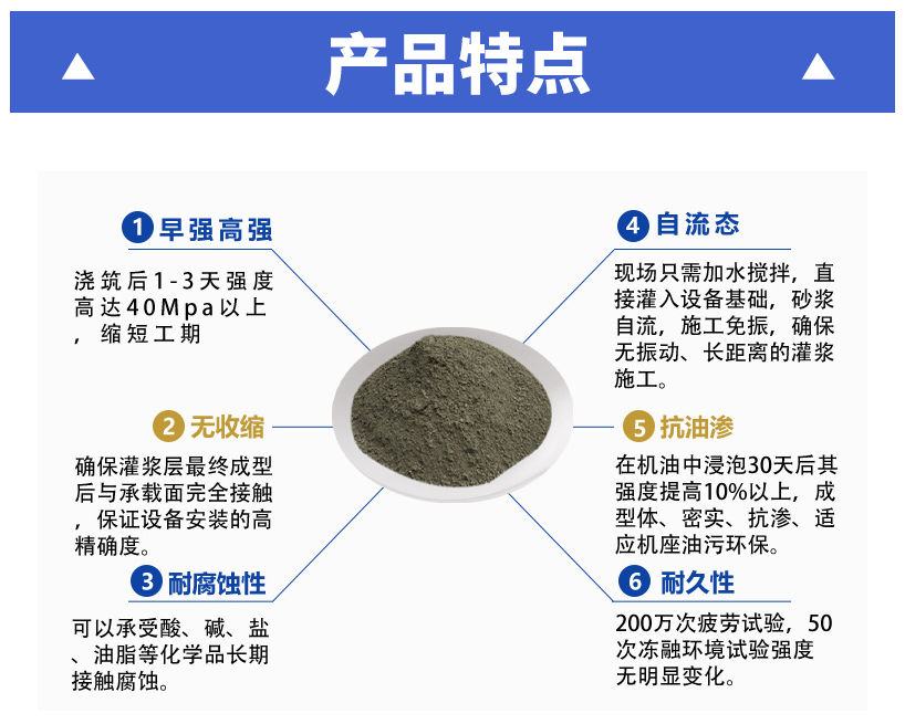高強(qiáng)無(wú)收縮灌漿料主要用于:地腳螺栓錨固、飛機(jī)跑道的搶修、核電設(shè)備的固定、路橋工程的加固、
